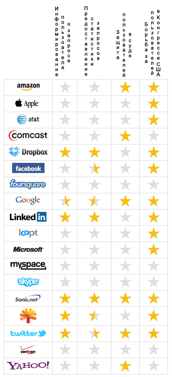 Исходя из всех этих требований, был составлен список интернет-компаний, которые защищают права своих интернет-пользователей лучше всего: