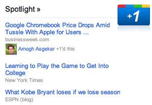 | | В блоге Google News появилось сообщение о том, что разделе сервиса Spotlight будут выводиться новости, которые получили клики +1 от друзей пользователя по соцсети Google + или его контактов в Gmail. Это значит, что авторизованные пользователи при использовании Google News увидят социализированные и персонализированные новости, которые соответствуют интересам их друзей и знакомых. Функционал раздела Spotlight позволит даже кликнуть на имя друга и проверить его профиль в Google+.  Разумеется, у самого пользователя, который искал информацию в Google News, тоже есть возможность кликнуть на кнопку +1 и выразить тем самым свое отношение к той или иной публикации. Это очередной шаг Google на пути интеграции социальных функций и сигналов в поиск. |