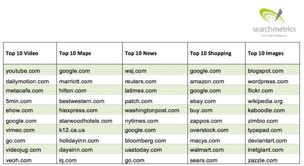 Собственные сервисы Google лидируют в разделах поиска по видео, картам, покупкам и картинкам. Исследователи из Searchmetrics объясняют, что в новостном контенте Google News не доминируют лишь потому, что URLы в поиске по новостям выдаются на сайты-источники, т.е. на Wall Street Journal, New York Times и др. новостные сайты, а не на сайты Google.
