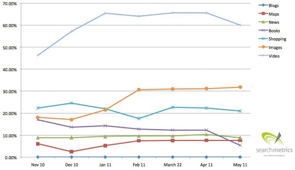 Компания Searchmetrics, занимающаяся поисковой аналитикой, провела исследование выдачи в универсальном поиске Google Universal Search. Целью исследования было выяснить, какие типы контента и сайтов имеют наилучшую «видимость» в универсальном поиске. Как выяснилось, с большим отрывом от других типов контента победили видео и картинки, а также любой другой контент, размещенный на сервисах Google.