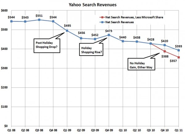 На этой неделе компания Yahoo опубликовала неутешительные финансовые итоги первого квартала 2011 года. Доходы компнаии от поисковой рекламы составили $357 миллионов, что на 19% ниже, чем в аналогичный период прошлого года ($440 миллионов). А по сравнению с максимумом доходов компании - $551 миллином, который был отмечен 2 года назад, нынешнее падение составляет и вовсе больше трети (на 35%).