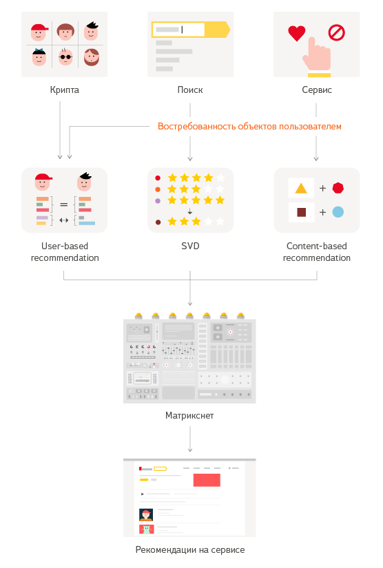 | | В блоге "Яндекса" появилась запись, посвященная рекомендательной системе "Диско". Её название прозвучало при открытии сервиса "Яндекс.Радио", но она же используется и в "Музыке", "Маркете" и "Видео" подразделах поисковика. Как указано в блоге, перед началом работы "Диско" уточняет вкусы и предпочтения пользователя. Получить такую информацию система может из ряда источников. Сперва проверяется история поиска, затем в ход вступает технология "Крипта", определяющая пол, примерный возраст и род занятий. Уже на основании данных из этих источников можно сформировать список того, что человеку заведомо не понравится. Затем в формулу включаются данные об использовании конкретного сервиса: "Маркет" знает, какие товары пользователь просматривал ранее, "Музыка" - какие треки слушал. "Яндекс" подчеркивает, что все данные о пользователях обезличены и их невозможно связать с реальным человеком.  Рекомендации "Диско" составляются тремя методами. В первом случае используется информация об объектах и связях между ними. Например, по информации о прослушанном ранее треке можно подобрать другой трек из того же альбома или того же жанра. Еще одна технология - связи между пользователями. Рекомендации такого рода основаны на общих для возрастной группы, пола и рода занятий интересах, выявленных у других пользователей. Третий подход основан на пользовательском взаимодействии с объектами, например - отметками "лайк" или просмотре видеоролика, что позволяет точнее определить наклонности клиента. Составленные рекомендации проверяет "Матрикснет", накапливая информацию о пользователе и проверяя варианты на актуальность. |