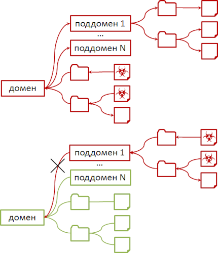 Сотрудники Яндекса постарались визуализировать схему определения зараженности всего сайта и поддоменов: