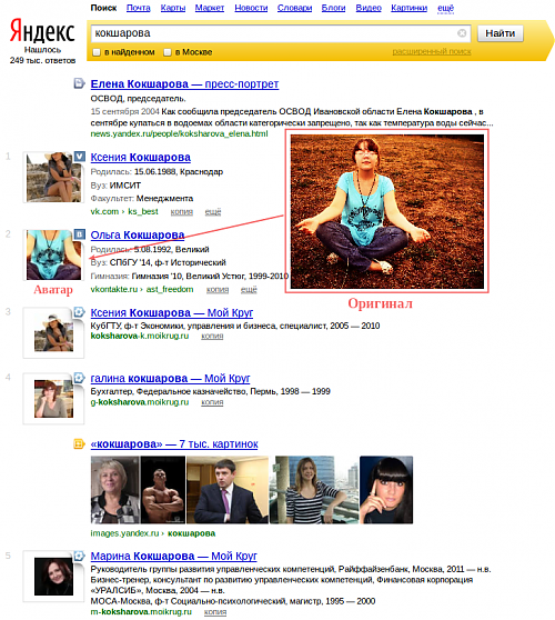Теперь "Яндекс" будет выводить фотографию профиля слева от ссылки на страницу в социальной сети, если таковая стала результатом поиска. Правда, стоит отметить, что это касается только профилей в профессиональной социалке "Яндекса" "Мой круг" и на сайте "ВКонтакте", который поисковик индексирует с конца 2010 года.