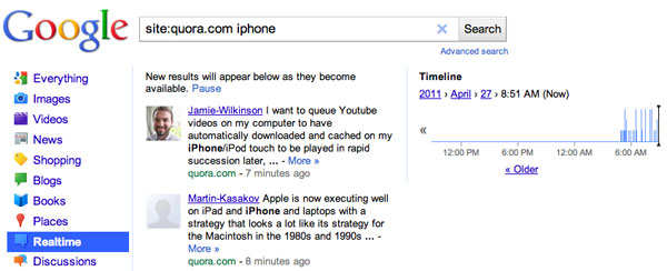 | | Живой поиск Google (Real Time) начал добавлять, помимо Twitter, Google News, Buzz новые источники информации в режиме реального времени – из Quora.com, Gowolla, Plixi, Me2day, Twitgoo и некоторых других, как пишет руководство Quora. Открытые профили Facebook и брендированные страницы тоже включены в поиск, хотя заметно, что они обновляются не в режиме реального времени.  Полный список источников «живого» поиска • Twitter • Google News • Google Blog Search • Новые созданные веб-старницы • Только что обновленные веб-страницы • FriendFeed • Jaiku • Identi.ca • TwitArmy • Google Buzz • MySpace • Facebook – брендированные страницы • Quora • Gowolla • Plixi • Me2day • Twitgoo |