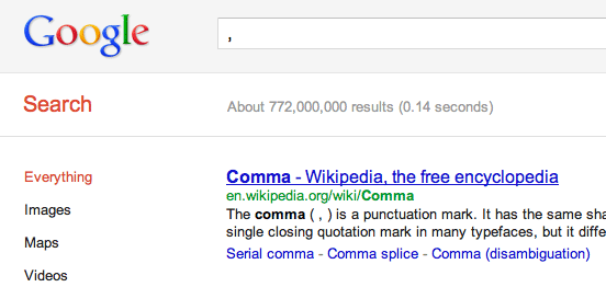 Раньше Google игнорировал большинство знаков пунктуации и не показывал по ним вообще никаких результатов. А теперь, например, по запросу [,] вы увидите страницу, посвященную правилам использования запятых на письме.