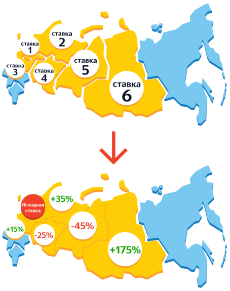Так, если поднять ставку для мобильных пользователей на 10%, а также задать 10% повышение стоимости для показов на территории Москвы, то стоимость показа на мобильном устройстве москвича окажется на 20% больше номинала.