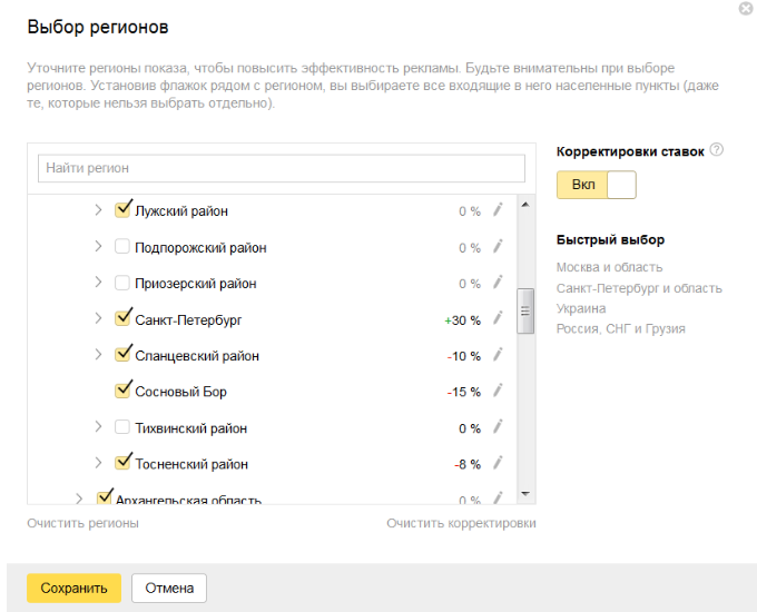 Индивидуальные ставки под регионы настраиваются в том же окне, что используется для настройки геотаргетинга. По умолчанию все города региона наследуют указанное значение, но можно вводить коэффициенты и на них.
