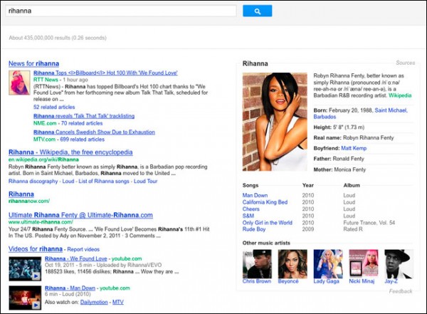 Первым скриншот с новым блоком о певице Рианне опубликовал в своем профиле G+ сотрудник SEOmoz Сайрус Шепард (Cyrus Shepard).