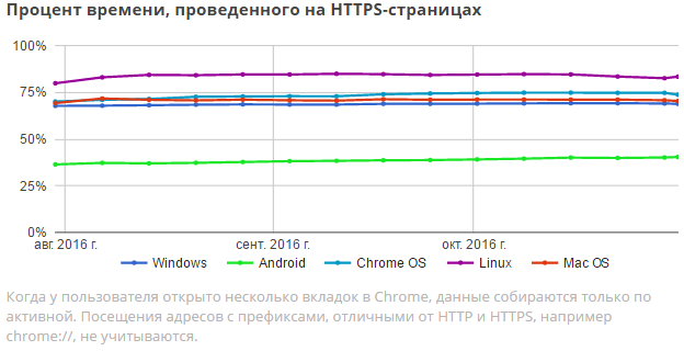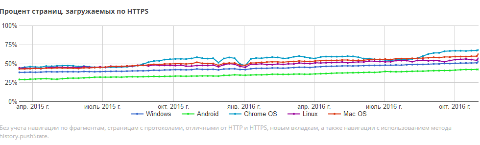 Согласно статистике Google, сейчас половина страниц, проходящих через настольную версию Chrome, относится к защищенным. Мобильная статистика еще не столь радужна - на Android HTTPS-сайты составляют 40 от всех посещений пользователей.