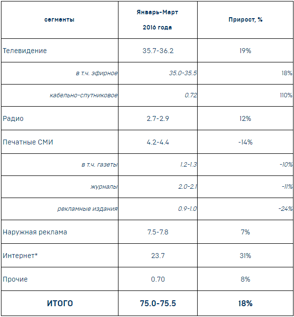Всего на рекламу было выделено 75 млрд рублей - на 18% больше, чем в 2015 году. По доходности интернет-реклама уступила только телевидению с 36 млрд рублей. Хуже всех чувствуют себя печатные СМИ, где в рекламу вложили на 14% меньше, чем год назад.