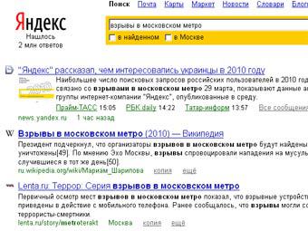 В пиковый момент терактами в столичной подземке интересовались более 900 тысяч человек в сутки. Следующей по популярности темой в 2010 году стали лесные пожары и смог в августе - около 500 тысяч запросов за будний день.