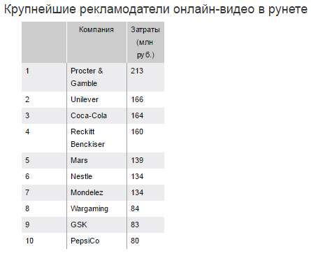 За анализируемый период компания Procter & Gamble потратила на видеорекламу 213 млн рублей и стала самым крупным рекламодателем года. Unilever вложил в видеорекламу 166 млн рублей, а производитель напитков Coca-Cola - 164 млн.