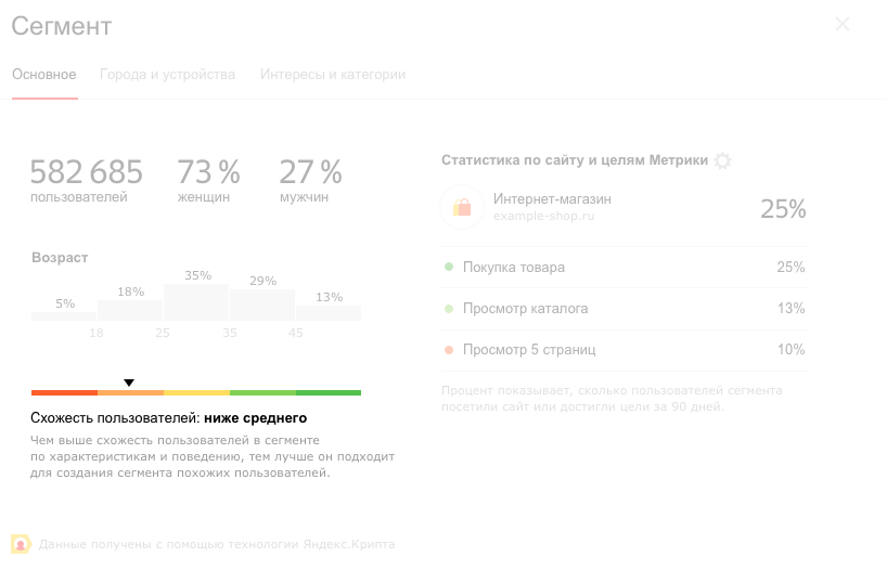 Степень схожести наглядно демонстрирует схожесть пользователей из сегмента друг с другом. Чем выше схожесть, тем эффективнее становится функция look-alike.